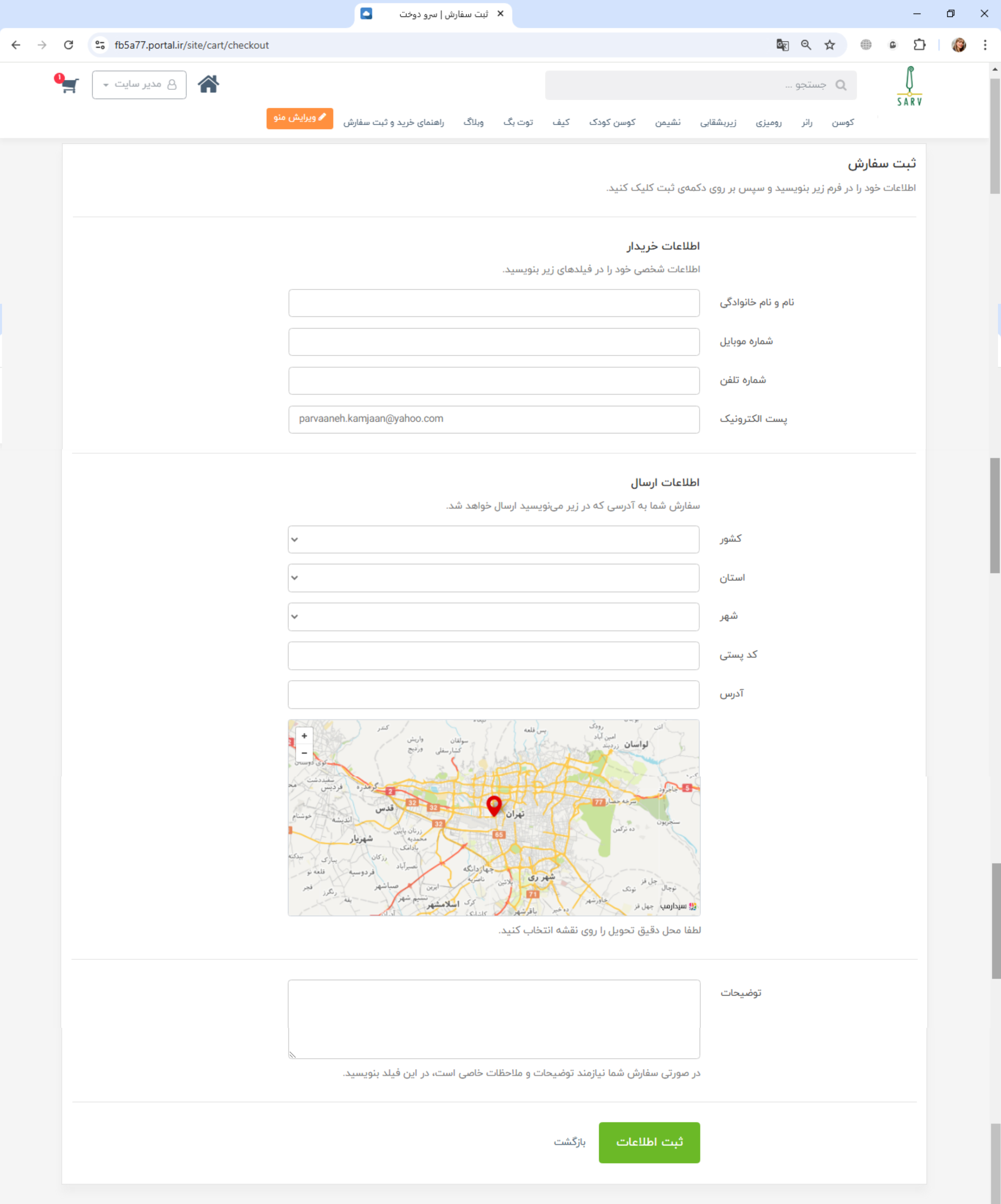 - بعد از اینکه همه محصولاتتون رو توی وبسایت سرودوخت انتخاب کردید، روی دکمه مشاهده وبسایت بزنید تا بتونید فاکتور خریدتونو ببینید. بعد روی دکمه ثبت سفارش که پایین صفحه هست کلیک کنید.